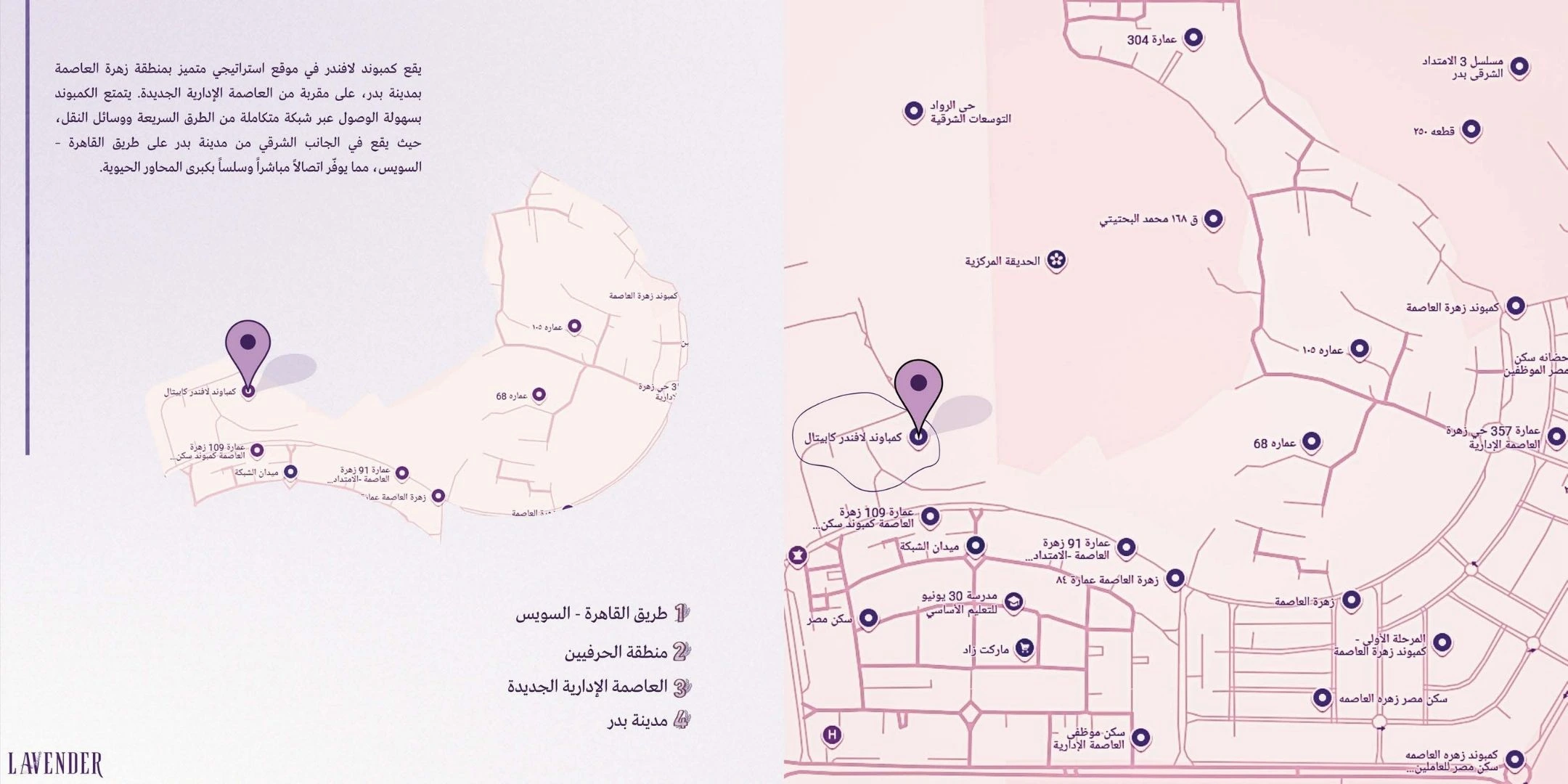 يقع كمبوند لافندر كابيتال في قلب زهرة العاصمة مباشرة أمام الحديقة المركزية، مع قربه من طريق السويس والعاصمة الإدارية الجديدة، مما يمنحه قيمة استثمارية عالية وسهولة تنقل.